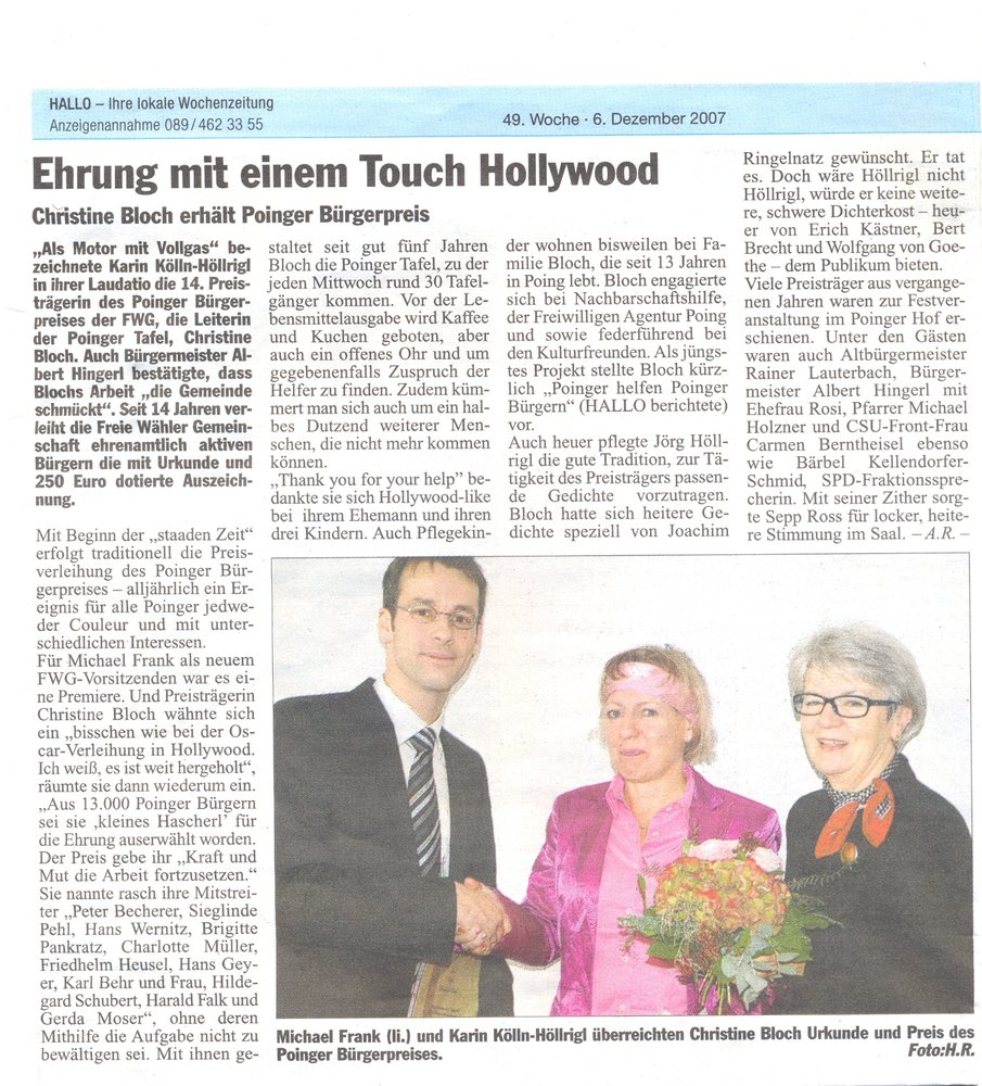Frau Karin Kölln-Höllrigl bezeichnete Frau Bloch als eine treibende Kraft und einen Motor, der mit Vollgas fährt. Denn nicht nur bei der Poinger Tafel findet man sie, sondern auch in anderen sozialen Bereichen. Ihr „Jüngstes Kind“ ist die Aktion „Poinger helfen Poingern“, bei der es darum geht, Familien in finanzieller Not durch Patenschaften, Sachleistungen (z.B. gebrauchte und funktionsfähige Haushaltsgeräte, Möbel etc.) oder Geldspenden zu unterstützen.